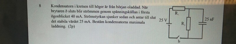 Jag förstår ej hur man ska ta sig an denna fråga.. Satt och tänkte på potential vandring, men det ser förvirrande ut med 2 olika ström angivna och R1 och R2 är okända . Jag tänker i början när B är sluten så går det bara ström genom R1 och 25 nF?