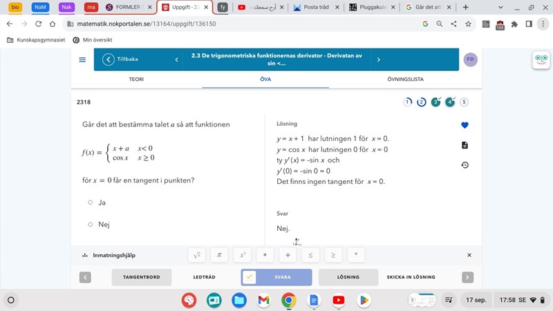 Går det att bestämma talet a så att funktionen för x=0 får en tangent i punkten?