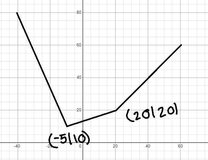Nedan är en bild på en funktion bestående av två absolutvärdestermer, det vill säga, en funktion y(x)=ax+b+cx+d. Grafens brytpunkter, (-5|10), (20|20), är utmarkerade.