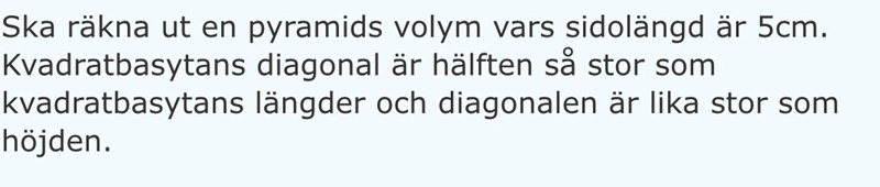 Jag ser framför mig en egyptisk pyramid, med fyra triangulära sidor och en kvadratisk botten. Vilket mått som är 5 cm känns inte självklart, ännu mer förvirrande är resten: