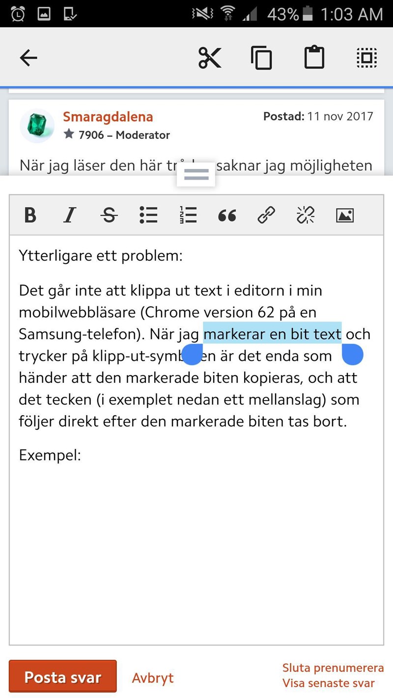 Det går inte att klippa ut text i editorn i min mobilwebbläsare (Chrome version 62 på en Samsung-telefon). När jag markerar en bit text och trycker på klipp-ut-symbolen är det enda som händer att den markerade biten kopieras, och att det tecken (i exemplet nedan ett mellanslag) som följer direkt efter den markerade biten tas bort.