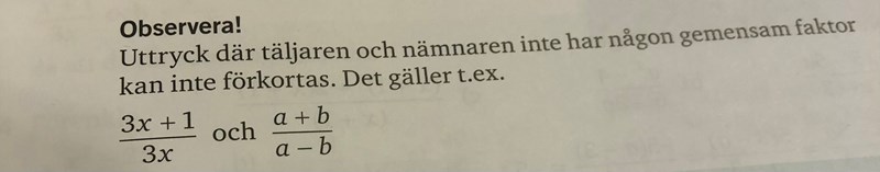 De gemensamma faktorerna måste finnas närvarande i samtliga termer i täljaren för att man ska kunna förkorta bort de faktorerna. Talet 1 innehåller inte faktorn 3 eller x