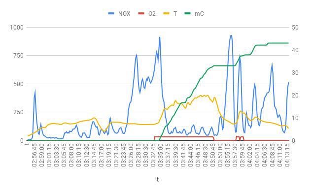Som vi ser ovanför börjar man pumpa in syrgas vid ca 03:33. Jag ser att mängden Kväveoxider (NOX) minskar drastiskt men varför? Dessutom ökar temperaturen av något skäl. Vad för slutsaters kan man mer dra och vad är orsaken till redan nämnda?