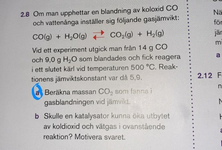Det fanns 0,5 mol kolmonoxid och 0,5 mol vatten från början. Det har bildats x mol koldioxid. Hur mycket kolmonoxid har förbrukats? Hur mycket kolmonoxid finns kvar? Hur mycket vatten har förbrukats? Hur mycket vatten finns kvar?  Hur mcyket vätgas har det bildats samtidigt?