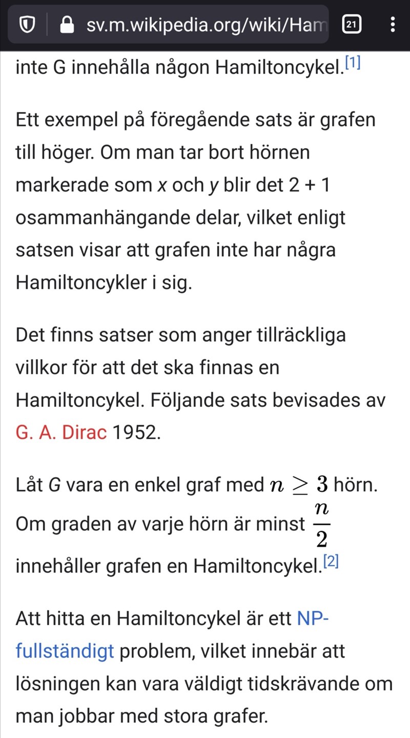 Menar du att jag utifrån dessa kanter och noder sedan skall försöka hitta en Hamiltoncykel som går från ursprungspositionen genom alla noder max en gång och sedan tillbaka till ursprungspositionen. Hur kan man då direkt från bara antalet kanter och antalet noder avgöra om det går att bilda en Hamiltoncykel eller inte?