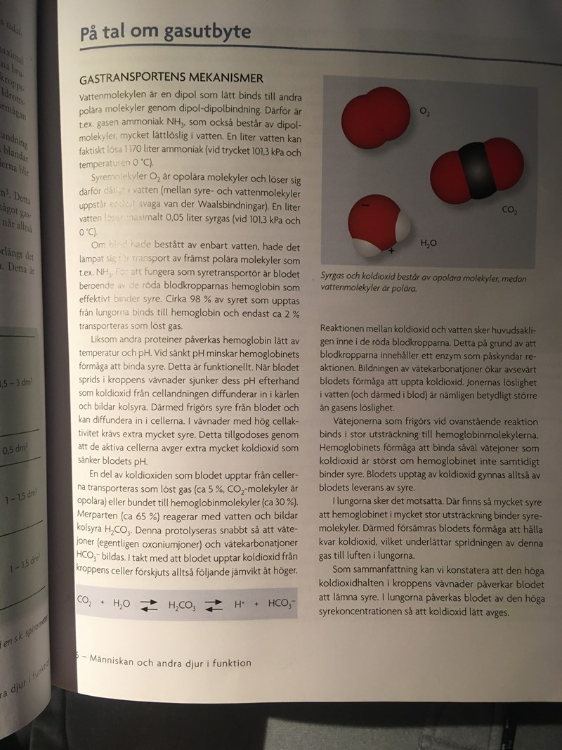 mag1 skrev:Det beror lite på vad resten av texten beskriver, och hur djupt detta beskrivs. Det finns ett samspel mellan hemoglobinets koldioxidupptag och dess frisättning av syrgasen - ett utbyte mellan bunden syrgas mot bunden koldioxid i hemogolbinet. Men hur detta utbyte fungerar återkommer på universitetsnivån, inte Bi2. Därför frågar undrade jag om sammanhanget, kanske försökte lärobokens författare att beskriva detta till Bi2?
