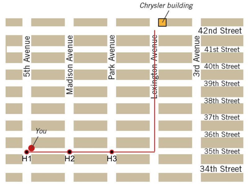På Manhattan i New York är gatorna i kvarteren parallella. Anta att du ska gå från korsningen 5th Avenue och 35th Street till Chrysler building.
