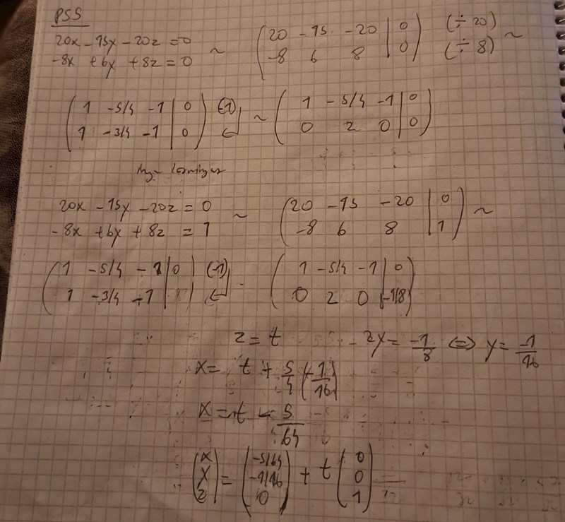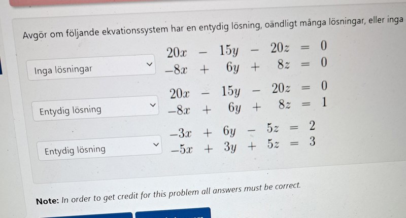 Observera att om ett ekvationssystem har fler obekanta än ekvationer har det alltid antingen oändligt många lösningar eller saknar lösningar. Första ekvationssystemet har (0,0,0) som en lösning så måste det ha oändligt många lösningar.
