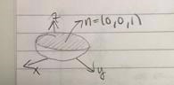 Ha bilden av ett halvklot i huvudet, just nu pratar vi om bottenytan. Bottenytan är ett plan, så dess normal kan vara (0,0,1) eller -(0,0,1), men vi ska välja -(0,0,1) för att normalen ska peka ut från kroppen K.