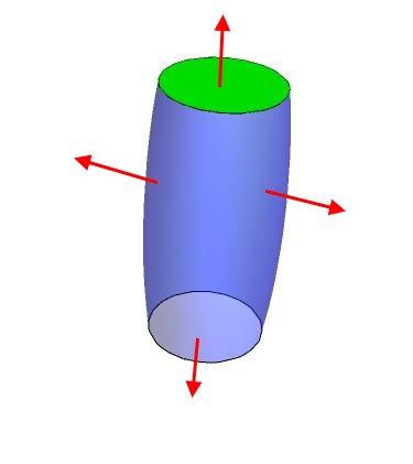 Därför kommer en utåtriktad normal från locket vara (utmed z-axeln, uppåt), bottenplattans normal är riktad (ut från botten, nedåt) och mantelytans normal är riktad ut från z-axeln i radiell led (den är alltså lättare att uttrycka i cylinderkoordinater)