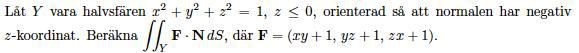 Använd rymdspolära koordinater! Nästan alltid när du har att göra med klot-formade områden är det lättare med rymdspolära koordinater. Du har alltså: med Gauss sats, applicera nu rymdpolära koordinater på detta område och integrera sedan term för term i 3 trippelintegraler (om man vill). Det som kan vara knepigt är att "z vinkeln" går mellan om jag inte misstar mig.