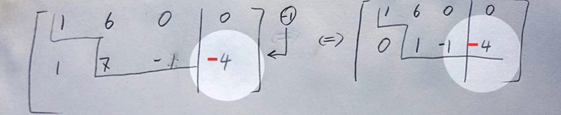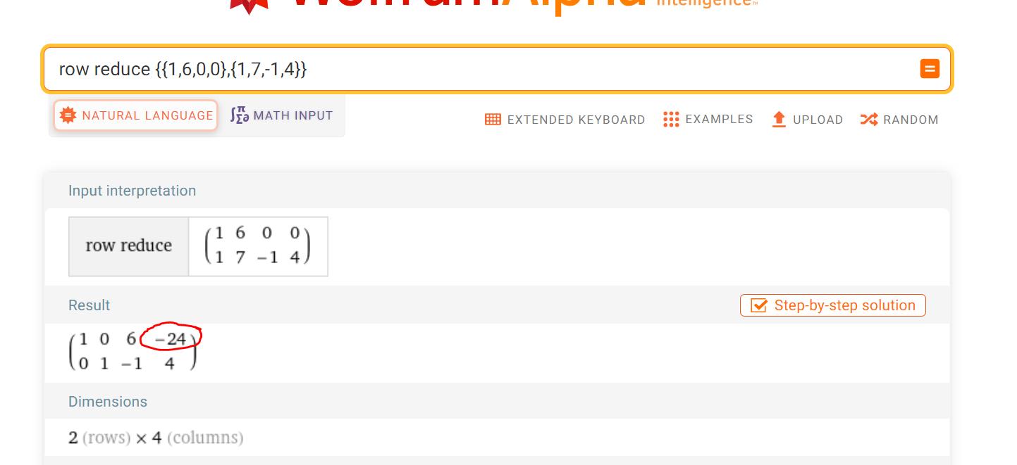 row reduce {{1,6,0,0},{1,7,-1,4}} - Wolfram|Alpha (wolframalpha.com)