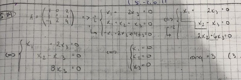 Multiplicerar alltså första ekvationen med -1 och adderar till andra, samt adderar ekv 1 med den tredje (för att eliminera x1). För att eliminera x2 sen multiplicerar jag andra ekvationen med -2 och adderar till den sista.