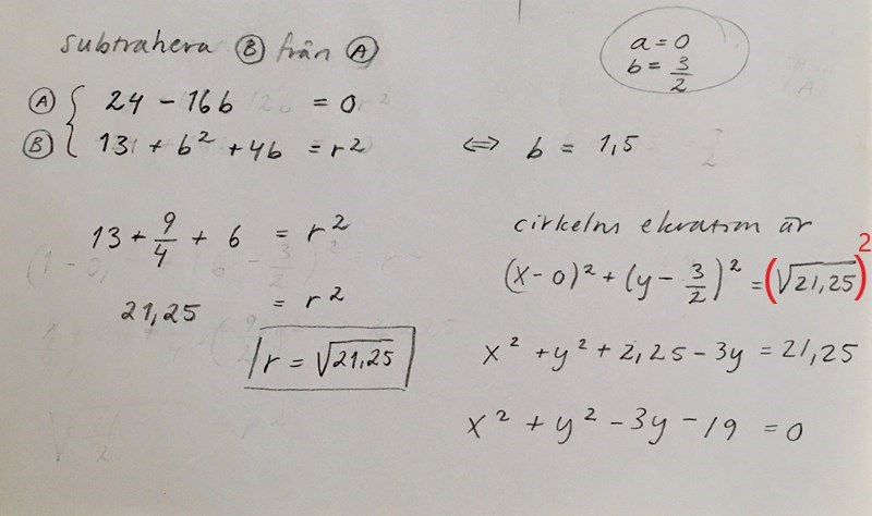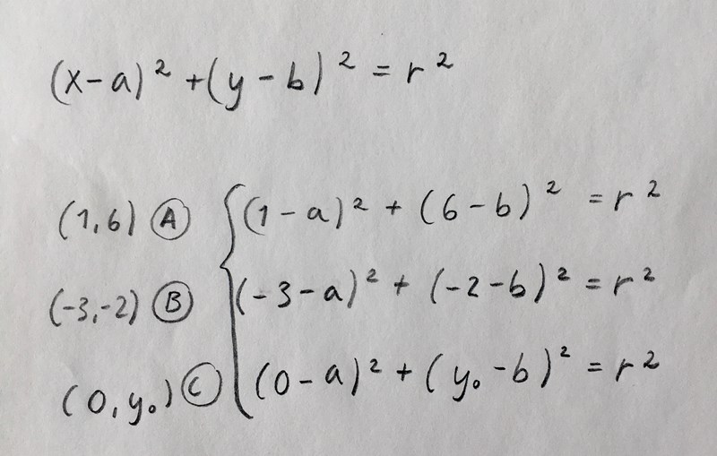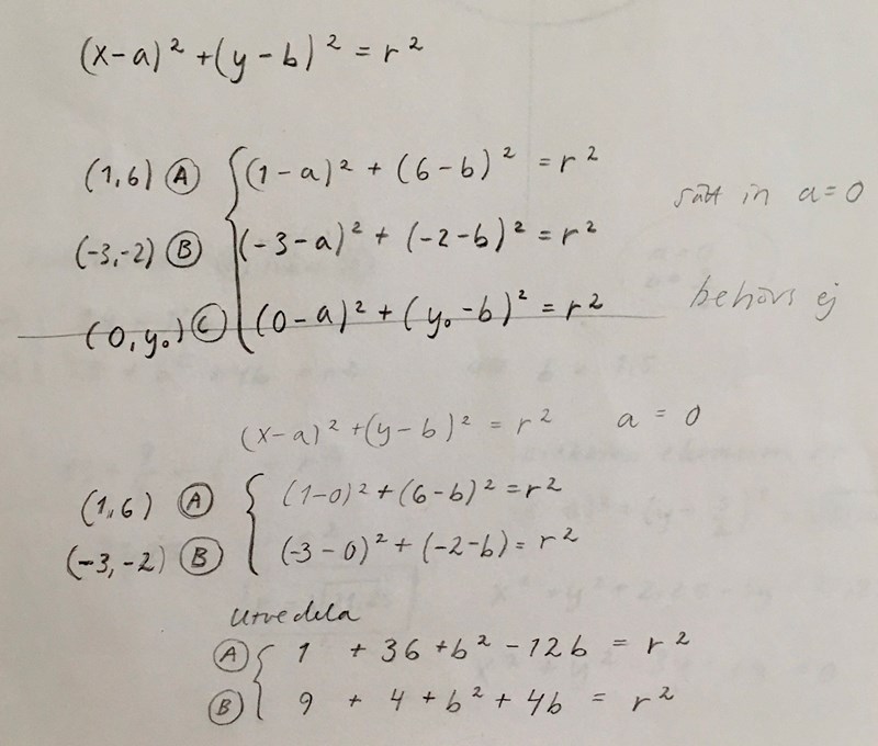 Jag kan kalla medelpunkten (a,b) och radien r och sätta upp tre ekvationer.