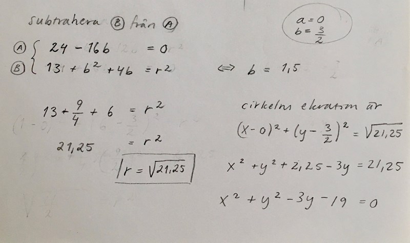 Jag har kört fast på en uppgift och skulle behöva hjälp att ge en ekvation för en cirkel som går genom