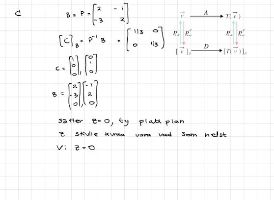 Det vi har gjort innan är att använda det som står i diagrammet för att lösa uppgifterna. Om vi har V och vill till Vb<-c så kan man väl bara ta övergångmatrisen P-1•B för att då C?