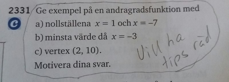 ainotnA skrev :Hej! Tyvärr kommer jag inte ihåg mycket från ma 2, du kanske redan har kollat på den men Fredrik Lindmark på youtube har förklarat uppgiften : https://www.youtube.com/watch?v=4okWCB6cwBc