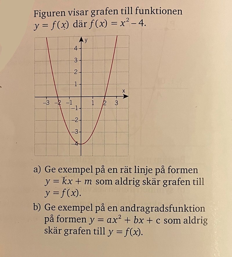 Ge exempel på en andragradsfunktion som aldrig skär i grafen till y = f(x)