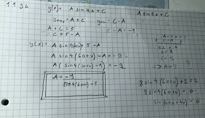 y(x)=Asin(k(x+v)+CAmplituden är halva avståndet mellan min och max: A=(5-(-1))/2=3