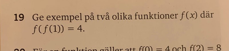 Hej! Jag har fått total hjärnstopp vid denna fråga och har absolut ingen aning om vad dem frågar efter eller hur jag ens ska börja för att lösa den här uppgiften? Vad betyder ens funktionen f(f(1)) = 4????