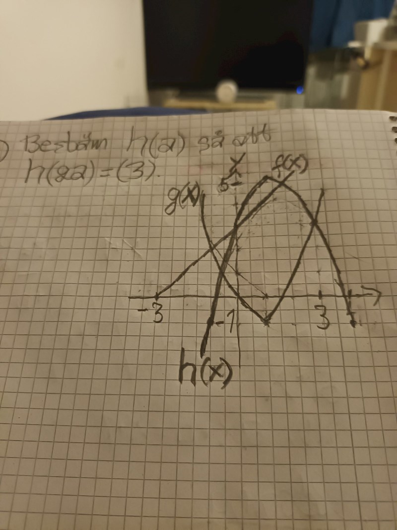 Jag läser av i koordinationssystemet att x=0 eller x=3 när y=3. Alltså h(2a)=3. Vilket ger 2a=0 eller 2a=3. Men sen vet jag inte hur jag ska göra för att få fram h(a)?