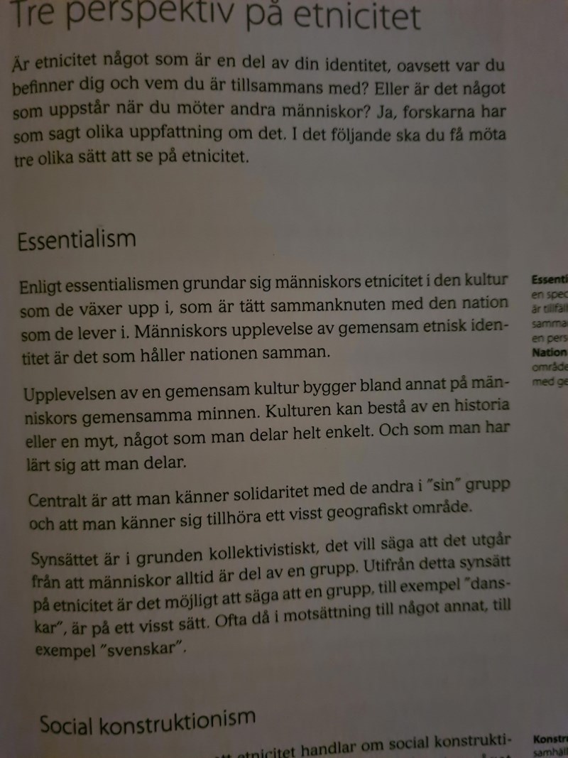 Det gäller tre olika etniska perspektiv som forskare kommit fram till så står det i uppgiften att man ska förklara de tre olika perspektiven och ge egen kritik på dom.