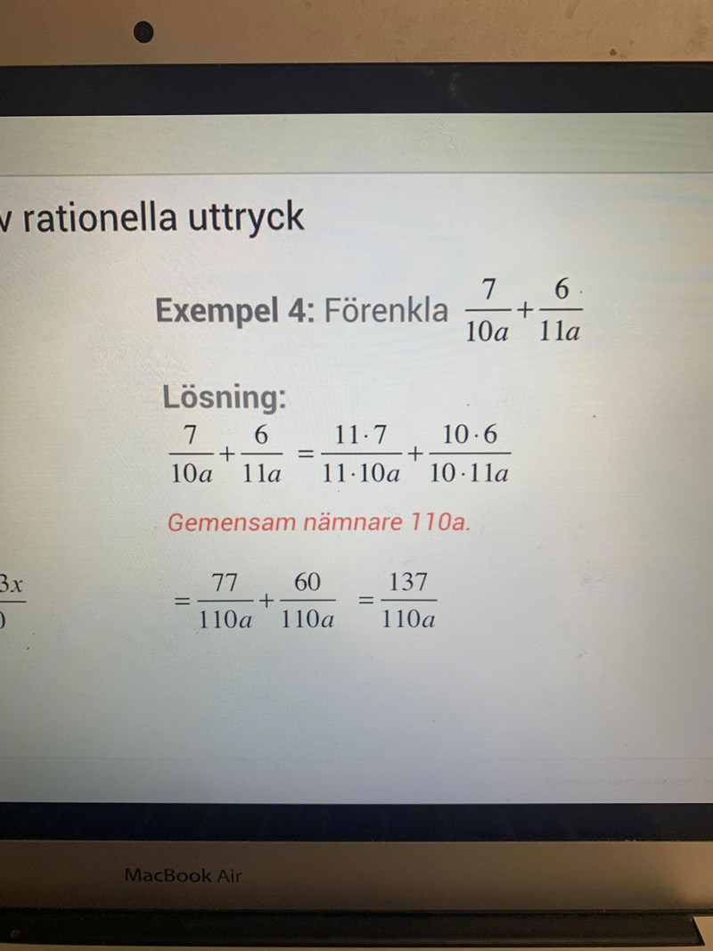 Jag fattar inte gemensamma nämnare är 110a det har dom bekräftat i föreläsningen men varför struntar dom i ”a” och bara multiplicerar med 110? Det ska ju multipliceras med 11a respektive 10a?