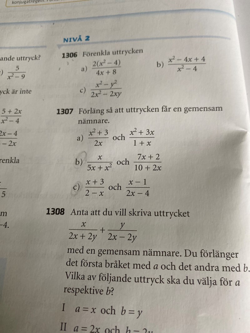 1307 b) Jag kom fram till ovanstående genom att multiplicera med motsatta nämnarna med motsatta bråken. Men frågan är hur jag ska förenkla och få samma nämnare.
