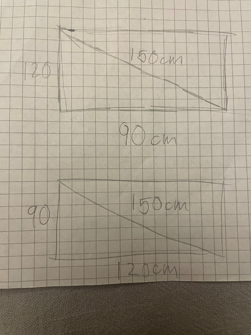 Signes föräldrar bygger en rektangulär sandlåda. De använder två stockar som har längden 90 cm och två stockar som är 1,2 meter långa. De mäter diagonalen och den är 15 dm. Är sandlådan rektangulär. Motivera ditt svar.