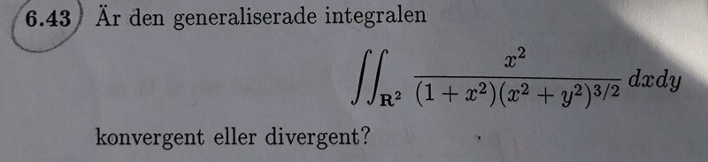 Eftersom både dessa konvergerar kan vi säga att integralen över R2 är konvergent och uppgiften blir även konvergent.