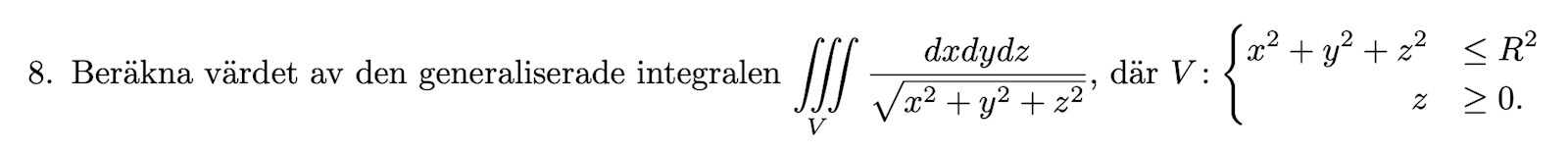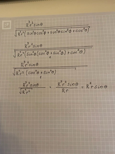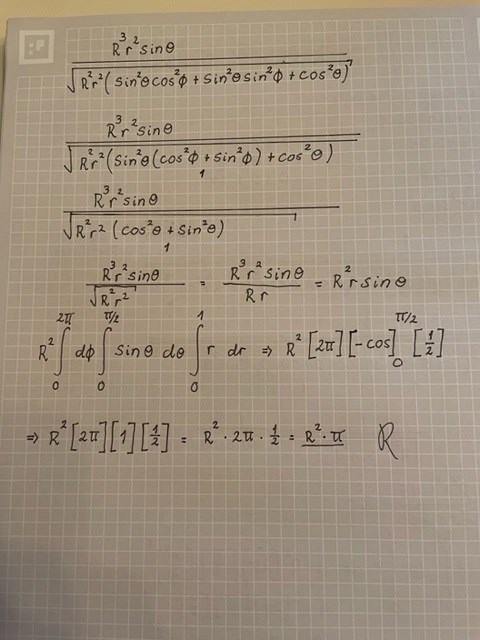 Antar att det måste blivit något fel när jag ersatte x y z i nämnaren med de sfäriska koordinaterna och försökte förenkla uttrycket. Jag har gjort uppgiften ett par gånger nu och fått samma svar samtliga gånger och ser verkligen inte vart jag slarvat någonstans.
