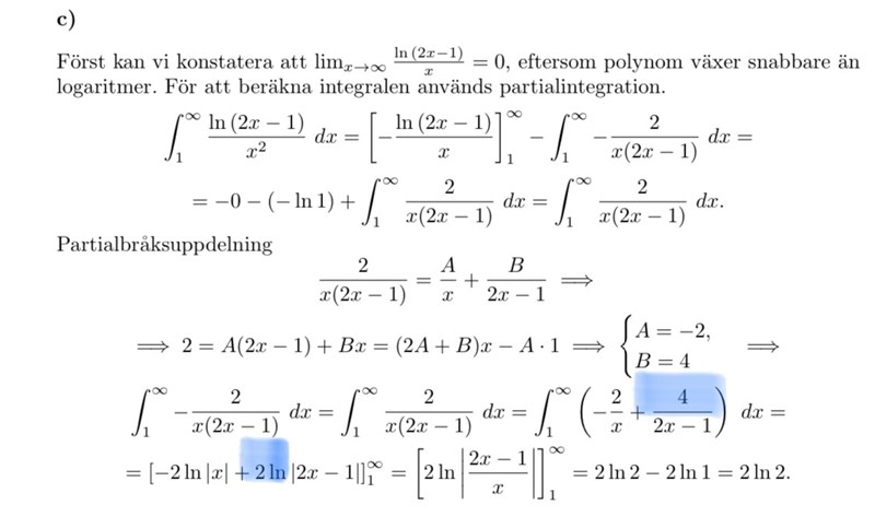 Hej! Jag förstår inte steget markerat med blått i denna uträkningen. Jag tycker att den ska vara 4 framför ln i den nedre ekvationen också, vad är det som gör detta?