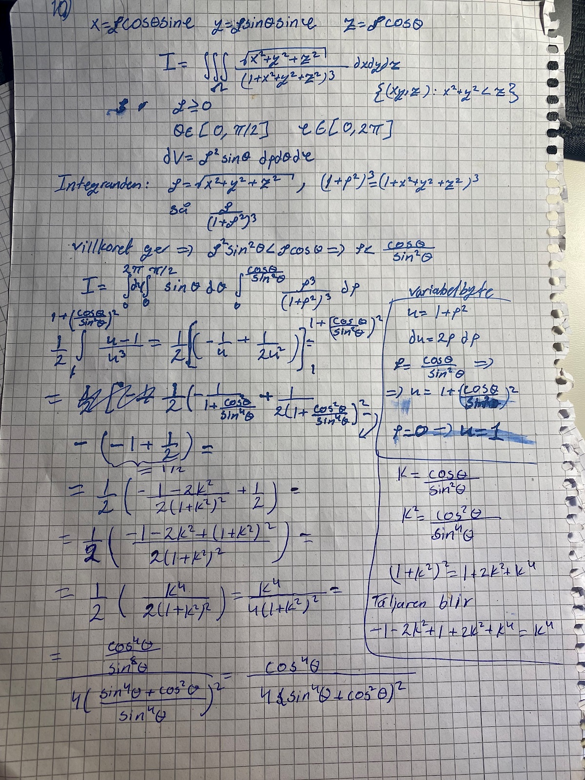 Jag tror att det har blivit lite fel i ditt variabelbyte. Ska det inte vara ? Vinkeln i för ska väl vara samma som vinkeln i för ?