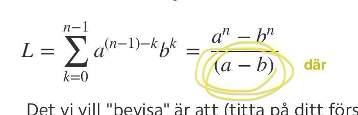 Jo, det är jag med! Vad jag är inte med är varför (a-b) delar inte ut a^n-b^n om vi vill få fram L.