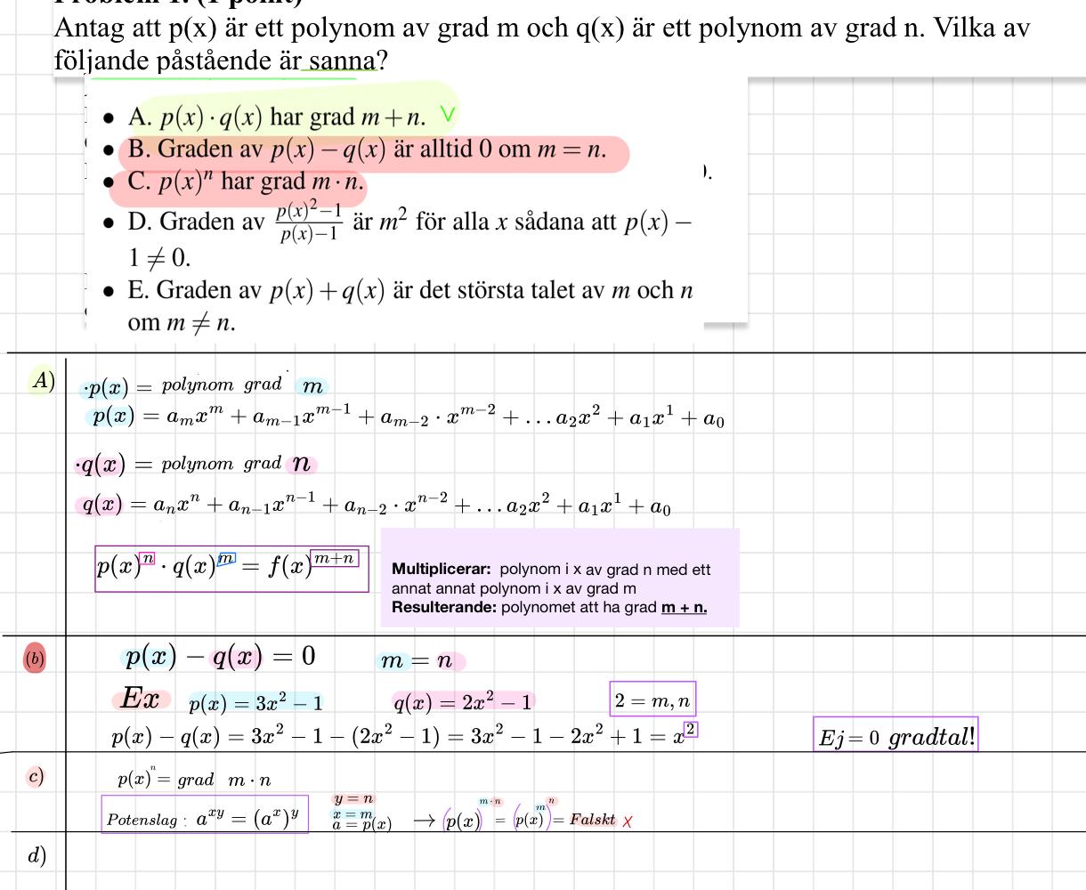 B inte gäller då konstansten a framför xn termen enligt a•xn avgör om det blir 0. Ex. Blir det noll om a i de polymom som skall subenheter är samma tas termen ut. Ex. för ax2termen om p(x) & q(x) skall subbraheras låt säga: p(x)= a1x2 och q(x)= a2x2 om då a1&a2= är båda 1. Kommer x2 termen tas ut förutsatt att x2 är högsta gradtalet för polynomen eftersom annars kommer också parantes vid subtraktion spela roll.