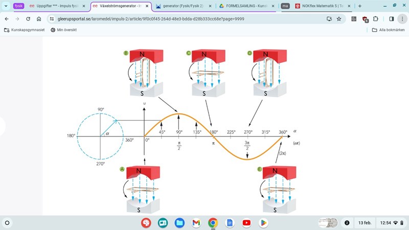 Om rotationen är konstant (konstant antal grader/s) så blir det en sinusformad kurva för magnetfältet genom spolen och spänningen som induceras.