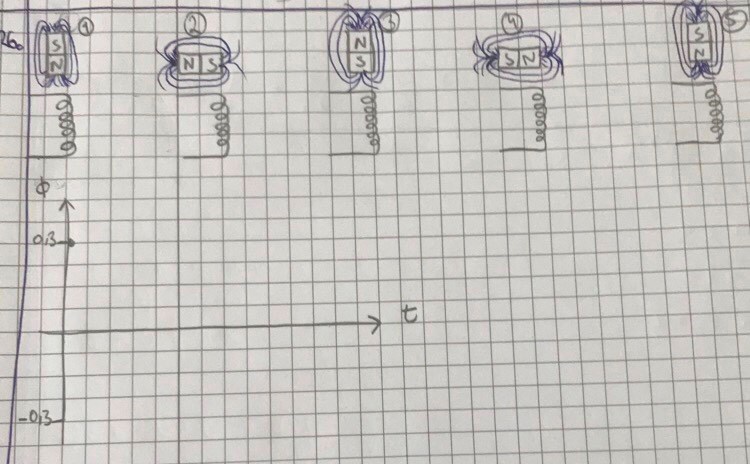 Jag tänker att vid första läget är det 0,3 Wb, det har de redan skrivit i frågan men jag tänker att det beror på magneten påverkar spolen med denna flöde då den har sin nordpol riktad neråt. När varken nord eller sydpol är riktade neråt, dvs i andra läget så är flödet genom spolen 0. Därefter så roterar magneten så att dess sydpol hamnar ner och då påverkas spolen med flödet 3 Wb fast med omvänt polaritet, oså fortsätter det med samma princip?