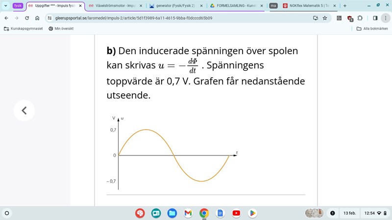 Grafen på spänningen matchar din kurva med flödet. Det blir högst spänning när förändringen i flödet är som störs och det är vid flödets noll-genomgångar.