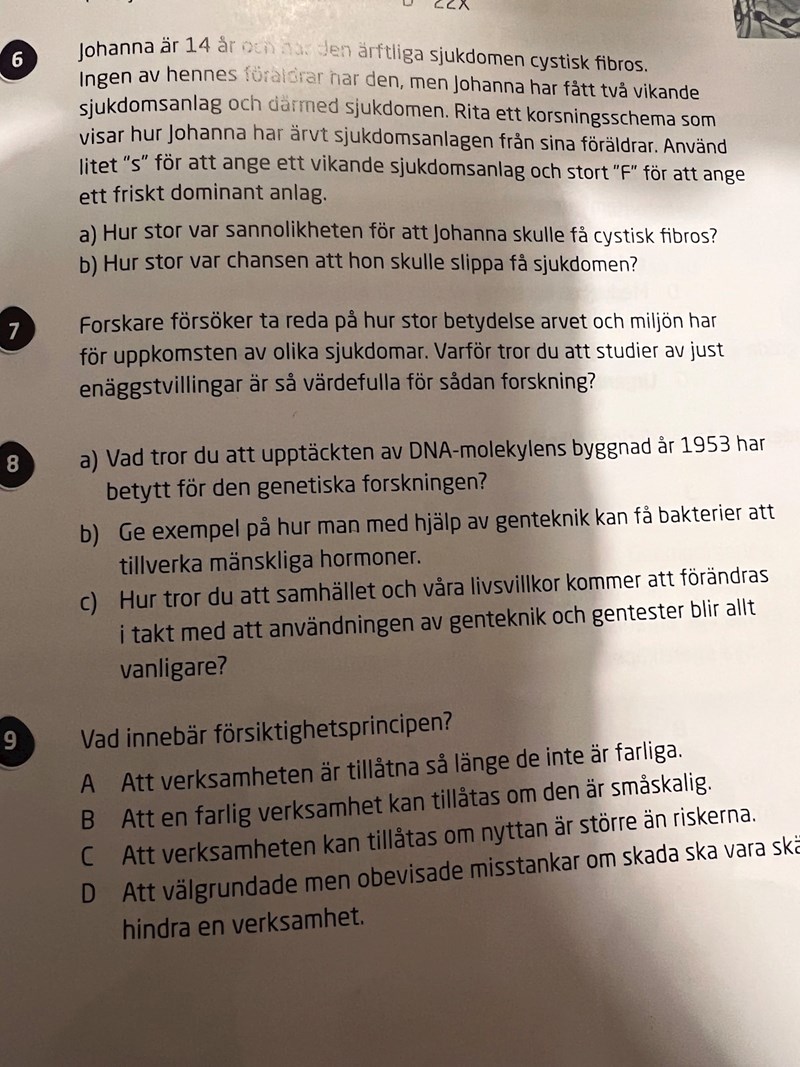 c) Man kan tillverka mer mediciner som har mindre biverkningar. Och med hjälp av gentekniken så kan man odla växter i det området som vanligtvis växten inte växer.Det gör att man importerar mindre av den växten till landet.Med gentester så kan man veta om man har en ärftlig sjukdom som kan botas eller för människorna att planera sitt liv med sjukdomen.