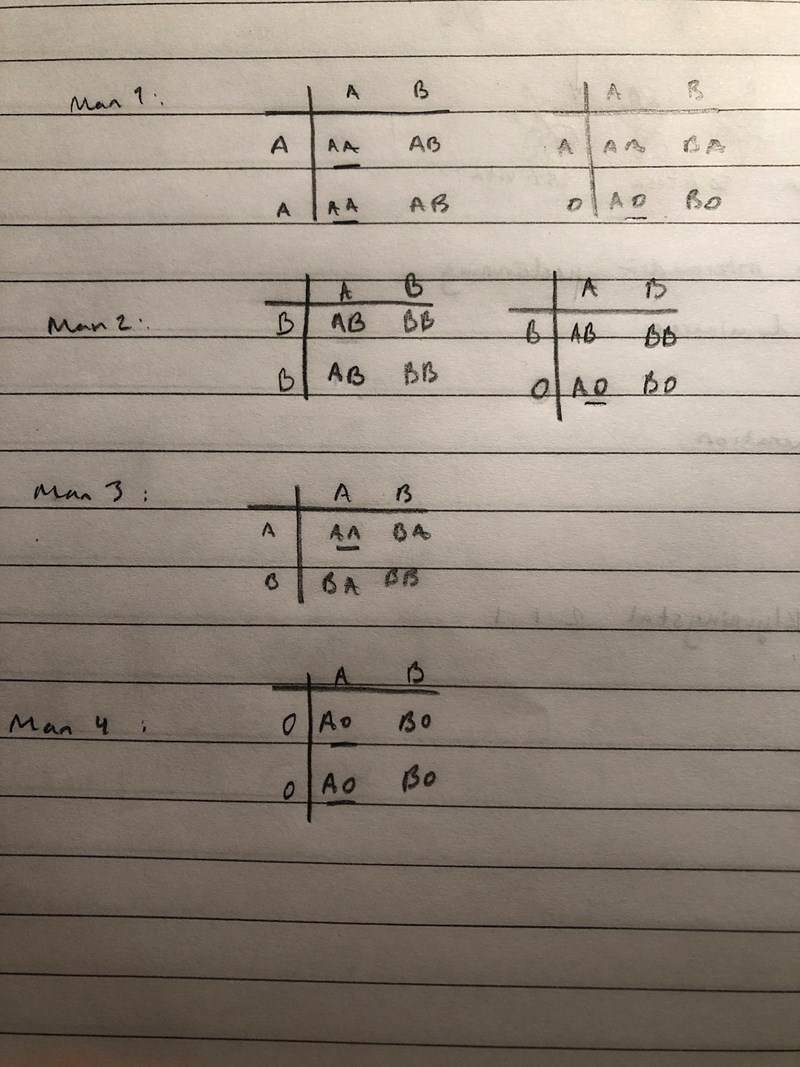 Man 4: Blodgrupp 0Jag ritade dessa korsningsscheman för att komma fram till svaret: