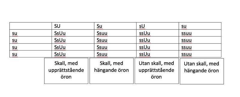 Heterozygot jakthunds gameter (hane): Ss, Uu --> Su, su, sU, su