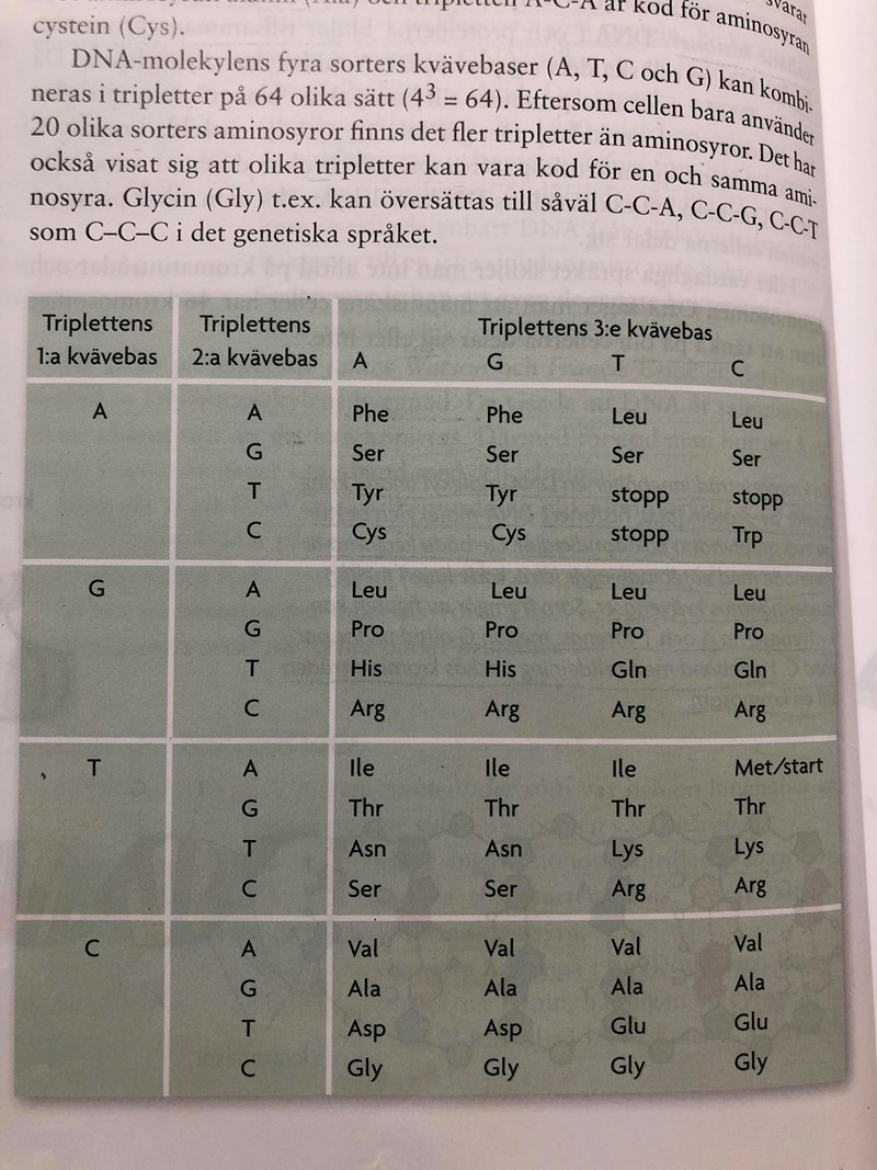 mag1 skrev:Det stämmer, nu vet du att den första aminosyran som DNA-sekvensen kodar för är leucin. Så då tar du bara nästa triplett (grupp om tre stycken) av nukleotidbaser - GCT - och ser efter vad den kodar för aminosyra. På så vis översätter du DNA-sekvensen till aminosyrasekvensen. Ibland kan det vara enklare att skriva dem under varandra med ett mellanrum mellan tripletterna, t.ex.