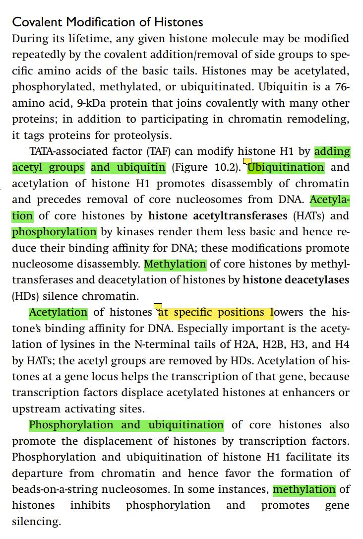 Andra stycket. Den första och andra meningen kan skrivas ihop till en enda mening utan förlorad information, vilken ordbajs. De var tvungna också att säga "adding acetyl and ubiquitin" omvänt andra gången för att låta varierade?? Detta stycket kunde lika gärna varit en punktlista, det är definitivt inte löpande text, de följer samma struktur: vad görs? Vilket enzym gör det? Hur påverkar det transkription? I den sista meningen avviker de från detta och berättar inte via vilken mekanism det sker utan skriver bara "silence".