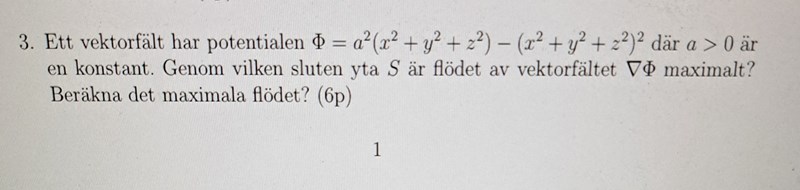 PATENTERAMERA skrev:Skissa vektorfältet och tänk lite på hur du skulle lägga en sluten yta för att flödet (ut) genom ytan skall bli så stort som möjligt.