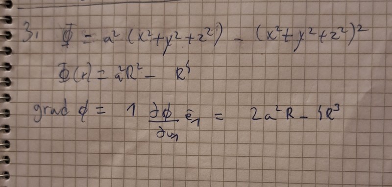 Men är det inte bättre att kalla phi för R^2=x^2+y^2+z^2 som är ett sfär med radie R? Känns som mer jobb att skriva phi i sfäriska koordinater. Då kan man använda gradphi för sfäriska koordinater för vi får phi(R)=a^2R-R^4