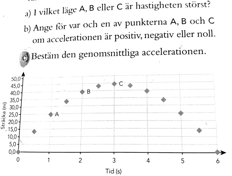 Jag ritade in två tangenter vid t=1,5 respektive t=5 (eller rättare sagt, jag hade en post-it-lapp som jag flyttade): den ena gick genom punkterna (2,40) och (0,10) och den andra genom (6,5) och (4,40) Vilka hastigheter ger detta för t=1,5 respektive t=5?