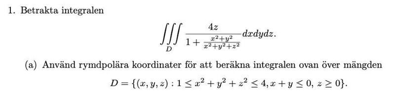 Ebola skrev:Området är en ihålig sfär vilken skärs av två plan vilket begränsar den till en kvartssfär om jag inte tänker fel. Detta kan du hursomhelst plotta relativt enkelt med sfäriska koordinater. Du kan annars plotta med kartesiska men då kan du inte skriva en olikhet. Då får du plotta två olika sfärer med radie 1 och 4.