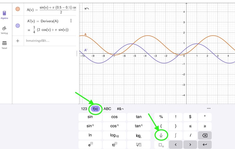 Det verkar som att Geogebra inte förstår primtecken (') som du har angett. Se varningstriangeln till vänster. Använd Geogebras tangentbord istället. Det gör du genom att klicka på f(x), d/dx och sedan ange funktionen som du vill derivera, osv.