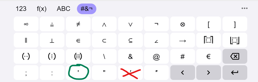 (Enkelt citattecken ’ som egentligen inte finns på tangentbordet funkar inte heller som derivatan. Vissa program såsom t.ex. officepaketet brukar ersätta apostrof med citattecknet. Man behöver därmed se upp ifall man kopierar+klistrar uttryck från ett annat program.)