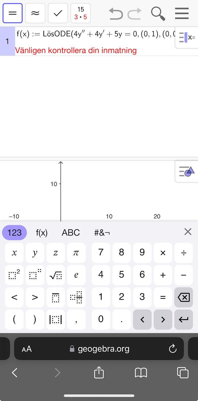 Jag gick nu in på ”Geogebra CAS Calculator” och skrev ”SolveODE” och skrev in differentialekvationen med dess begynnelsevillkor men får fortfarande samma ”error”… Hur gick du tillväga??